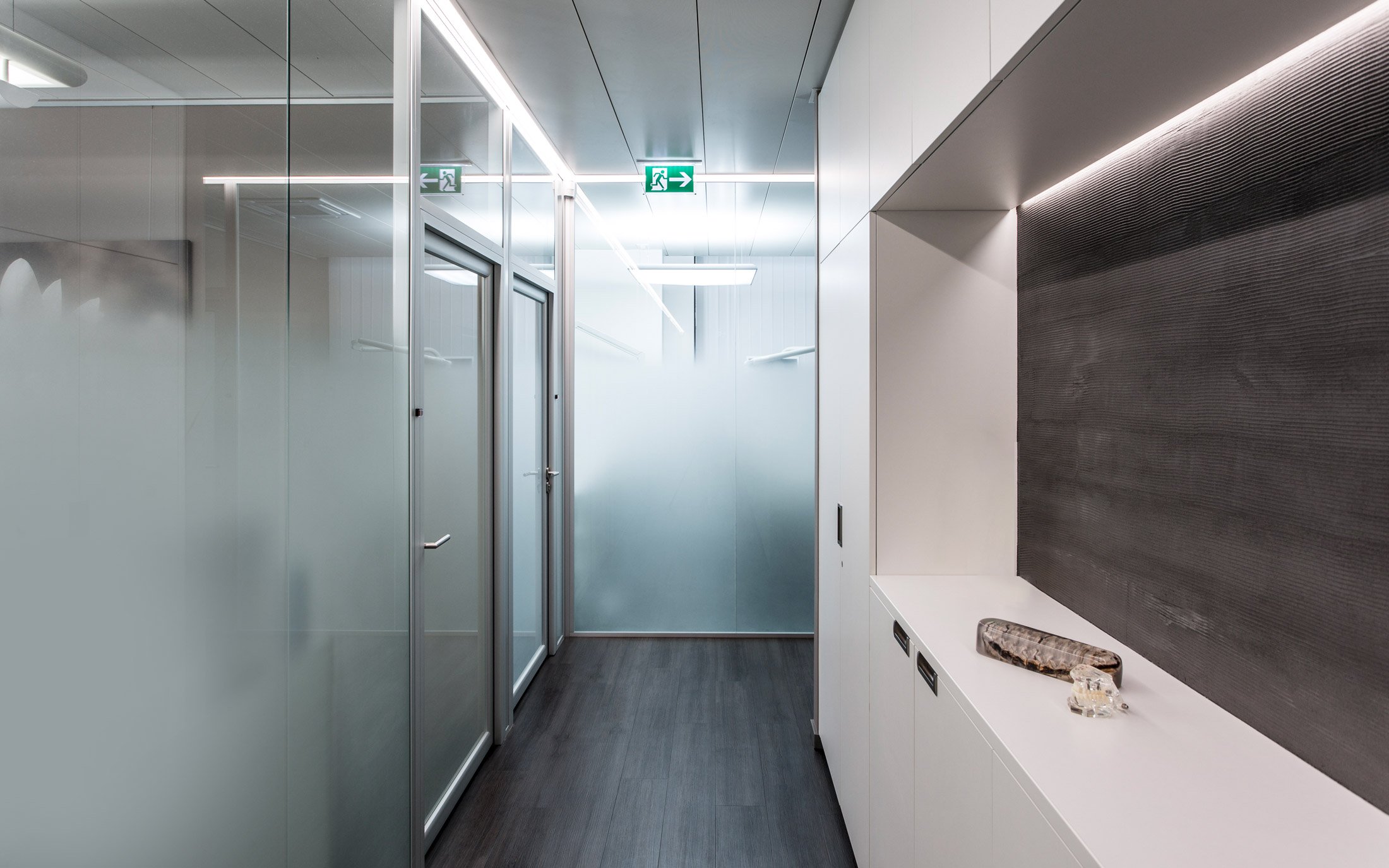 La privacité requise pour les cabinets est réalisée avec un traitement des verres au sablage dégressif alors que des jalousies verticales filtrent les vues depuis l’extérieur. Les teintes et textures choisies apportent une ambiance chaleureuse et élégante aux espaces.