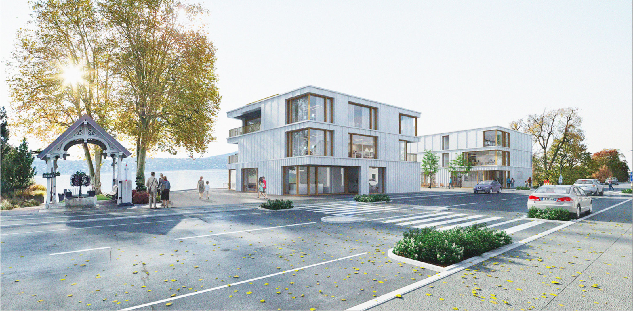 Le projet s’inscrit dans ce site majestueux par l’implantation de 2 bâtiments détachés. Cette nouvelle composition s’intègre en continuité dans la morphologie du bâti le long du lac à Bellevue et offre une percée visuelle supplémentaire depuis la rue sur le panorama du lac et des montagnes.
