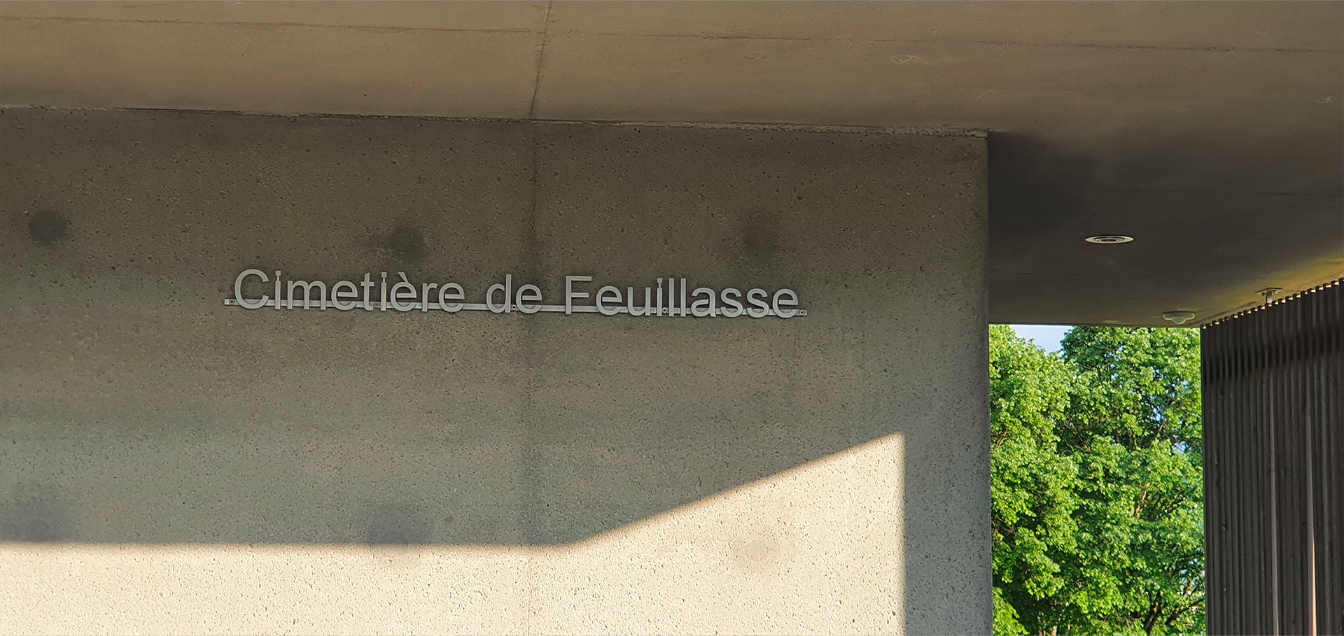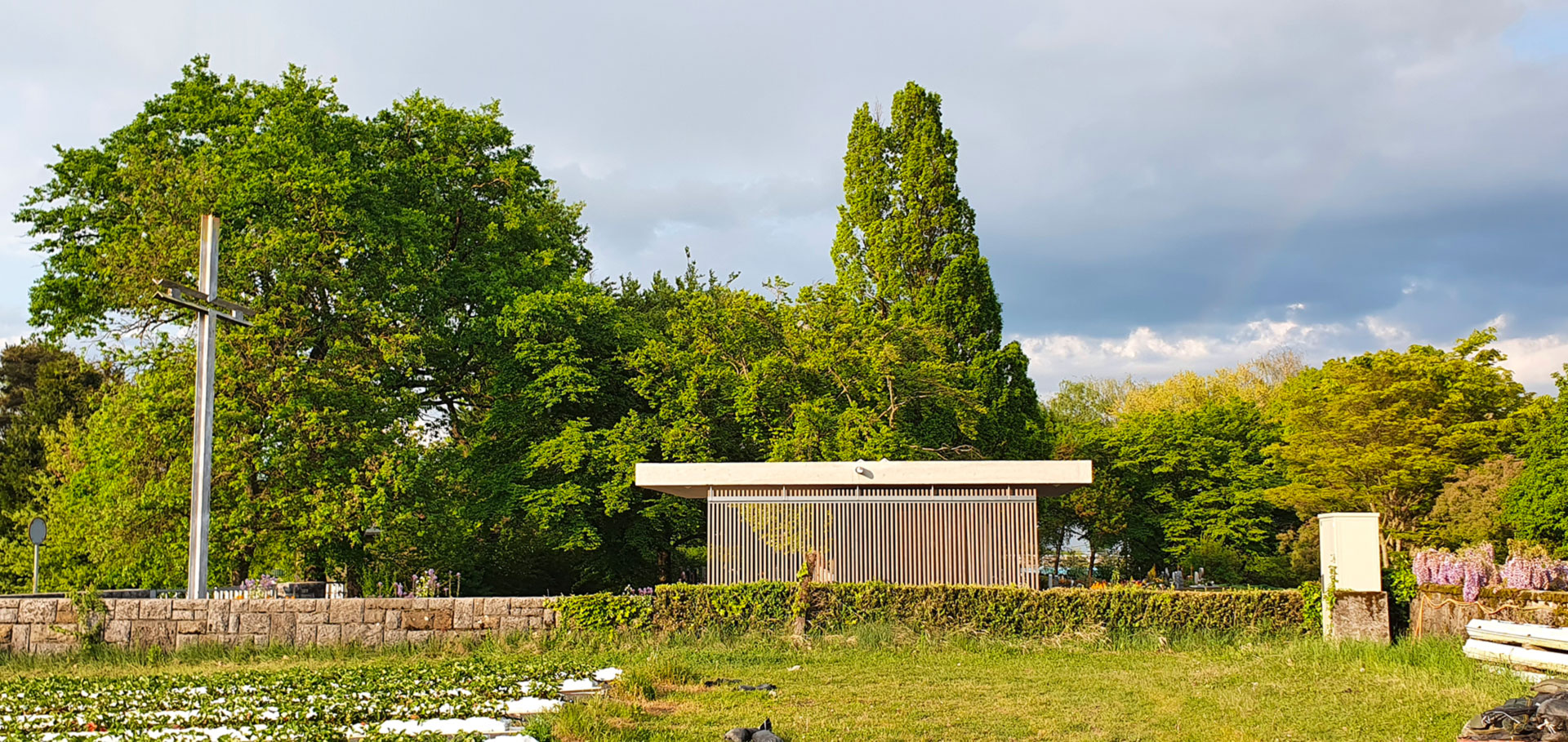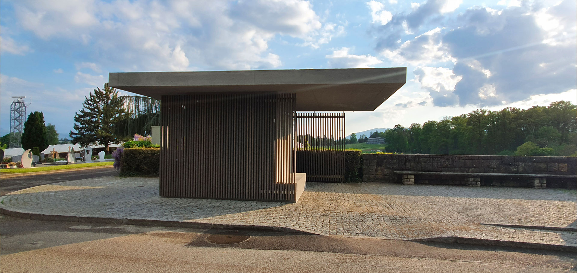 Situé sur l’espace d’entrée du cimetière, ce petit édicule offre pour les visiteurs un espace couvert, un lieu d’aisance et une vasque pour l’entretien des stèles. Ses lignes pures en béton sablé sont complétées par deux écrans en lames de bois ajourées qui articulent les différents usages. Le pavillon par sa tectonique invite au recueillement et à la contemplation.